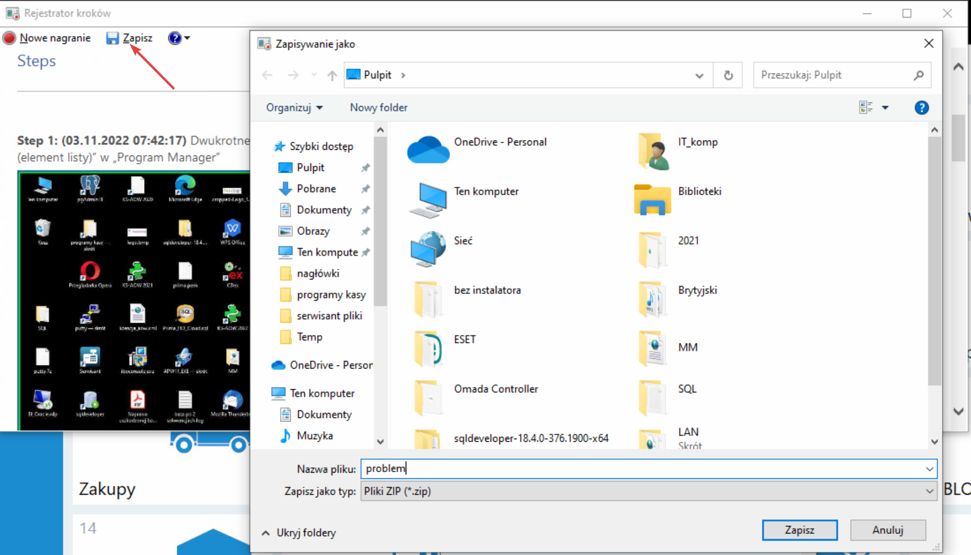 Po zakończeniu nagrywania klikamy przycisk Zapisz i nazywamy archiwum ZIp i wysyłamy je do działu IT na adres e-mail helpdesk@aptekiprima.pl